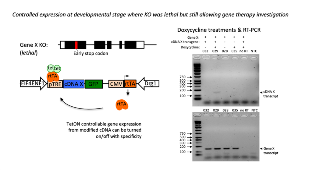 Recently, we developed a double transgenic model for examination of a gene therapy to treat a specific patient gene mutation in a highly debilitating genetic disorder. The disorder is lethal in mice, making examination of gene therapies in vivo very difficult. First, part of the endogenous mouse gene was replaced with the human sequence containing the specific patient mutation, without disrupting transcriptional or translational signals. By introduction of an antibiotic-controlled cDNA at a separate open locus, protein expression is preserved until antibiotic is removed in a controlled manner to allow disease progression and examination of the gene therapy..